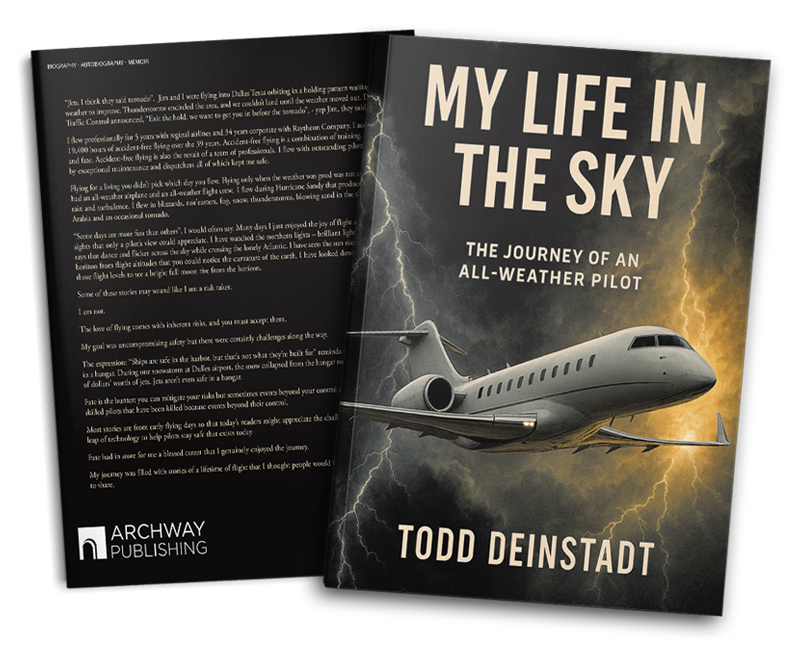 Jim and I were flying into Dallas Texas orbiting in a holding pattern waiting for the weather to improve. Thunderstorms encircled the area, and we couldn’t land until the weather moved out. Dallas Air Traffic Control announced, “Exit the hold, we want to get you in before the tornado”, – yep Jim, they said tornado. I flew professionally for 5 years with reginal airlines and 34 years corporate with Raytheon Company. I accumulated 19,400 hours of accident-free flying over the 39 years. Accident-free flying is a combination of training, experience and fate. Accident-free flying is also the result of a team of professionals. I flew with outstanding pilots supported by exceptional maintenance and dispatchers all of which kept me safe. Flying for a living you didn’t pick which day you flew. Flying only when the weather was good was not an option. We had an all-weather airplane and an all-weather flight crew. I flew during Hurricane Sandy that produced windshear, rain and turbulence. I flew in blizzards, nor’easters, fog, snow, thunderstorms, blowing sand in the desert of Saudi Arabia and an occasional tornado. “Some days are more fun than others”, I would often say.
